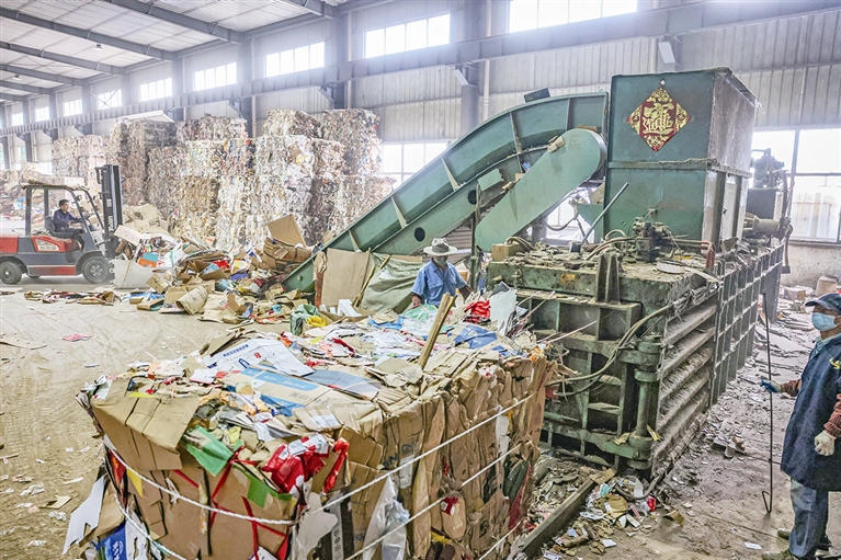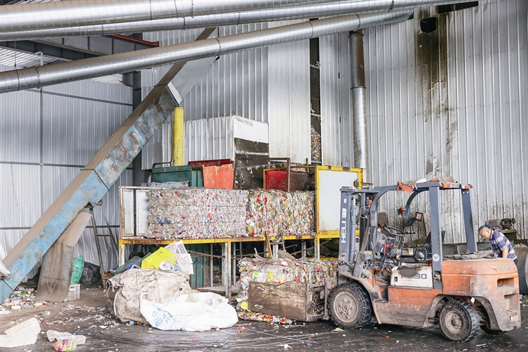 廢紙、廢塑料、廢玻璃、廢舊家電等可回收物在靖江市再生資源交易市場分揀加工中心經分類打包處理后,由相關有資質加工企業進行循環利用。