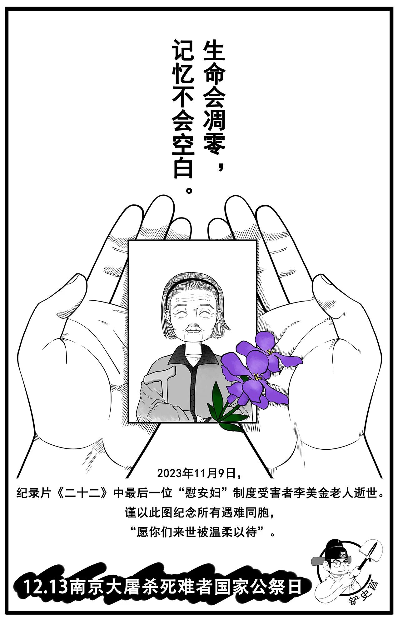 今年的漫畫主圖描繪了一雙捧著老人照片的手,照片上覆蓋著紫金草。“照片上的這位老人,代表近年來陸續去世的'慰安婦'制度受害者老人,更代表在抗日戰爭中遇難的所有國人同胞。而圖片上的這雙手是我的手,也是你的手,是我們所有人的手。我們用這雙手捧起照片,看著這張照片,也會記住這張照片。”朱彥說,生命會消失,但是不會被遺忘,漫畫是希望大家記住照片上的人,記住這段歷史。