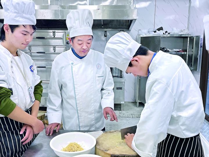 △王學桂指導學生剽制干絲。 開班儀式后,烹飪班學生們圍在桌旁,左手按豆干,右手持刀,仔細剽制著干絲,將手中厚2.5厘米的豆干剽成薄片整齊排列,再將薄片斜鋪切成火柴棒大小的細絲。王學桂提醒學生,要強化基本功訓練,全面了解、掌握早茶制作的整套流程,才能感知傳統技藝的精華,才能勝任泰州早茶產業的崗位需求。當天還開展了《泰州早茶文化》講座,同學們對泰州早茶的起源、老字號、品種等有了更深入的了解,在互動環節,大家踴躍提問早茶相關問題,現場氣氛熱烈。 泰州早茶歷史悠久,是本地獨特飲食文化的代表,是“水城慢生活”的城市旅游名片。對于追求“塵世幸福”的泰州人來說,一天的生活是從體驗早茶開始的。爽滑多彩的燙干絲、香濃可口的魚湯面、鮮美多汁的蟹黃包、翠綠欲滴的翡翠燒麥是泰州早茶的代表性餐點。近年來,歷久而彌新的泰州早茶受到越來越多專家學者、市民游客的關注和喜愛。 為貫徹習近平總書記“大力發展技工教育”的重要指示,適應地方產業發展,更好地服務幸福泰州,泰州技師學院和市文旅集團深耕校企合作,在專業建設、人才培養等方面達成共識,雙方發揮優勢、共同發力,將泰州早茶融入烹飪專業教學,共同培養思想素質過硬、掌握泰州傳統早茶技藝的技能型人才,助推泰州傳統文化傳承和早茶產業服務。 根據泰州早茶制作技藝、崗位核心技能及早茶文化特色,校企共同研究、精心策劃“泰州早茶”進課堂方案,按序時進度循序漸進,在2023年11月至12月的五周時間里,每周28節課,由學院專業教師和泰州早茶集團導師面對面傳授、點對點指導,將“五味干絲、水晶肴肉、油炸花生米、水煮花生米、冰糖紅棗、脆鱔、蒸餃、燒麥、包子、魚湯面(餛飩)、干拌面”技藝嵌入課堂。泰州早茶集團還將提供職業導讀、崗位實習機會和場所、就業機會、師資培訓和游學參訪等服務。目前方案實施班級為2127烹飪班,該班學生已完成中式烹調中級工認定,下學期將開始崗位實習。 泰州技師學院還將把泰州菜、泰州早茶等地方特色菜制作技藝和文化,分階段融入課程體系。 |