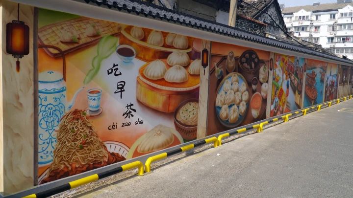 “做包子的場景很生動”“看到這個圖,我想吃干絲了”……近日,在泰州市海陵區城中街道鐘樓社區打笆巷,居民看著墻上的彩繪,感受著泰州人吃早茶的熱鬧場景。