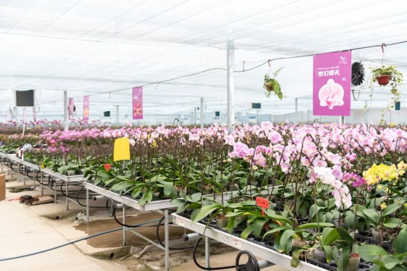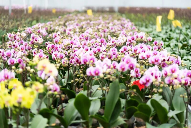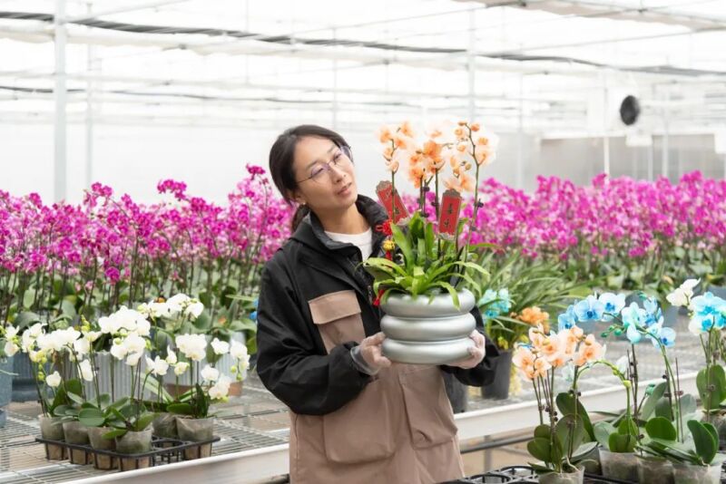 蝴蝶蘭本是熱帶植物,對于生長環境要求極高,它喜高溫、高濕,又忌悶熱、通風不良,對溫度十分敏感,生性挑剔的它如何適應江蘇泰州的環境? 張瑩為我們解開疑惑:除了原生環境,只有智能化溫室里才能養出蝴蝶蘭。大棚用的是荷蘭進口的普瑞瓦花卉種植管理系統,所有的溫度和濕度可以通過手機進行控制,白天溫度控制在25℃左右,夜間控制在18-20℃之間。 “在基地智能大棚的調控下,不僅蝴蝶蘭的成活率顯著提高,人工成本也大大降低,品質更是上了一層樓。”張瑩說。 技術在國內排前三 張瑩介紹,蝴蝶蘭基地從2022年8月開始種植,一期占地5500平方米,二期占地3800多平方米,現有成品蝴蝶蘭16萬株,主要有大辣椒、寶貝、黃格格等113個品種。 除了常見的品種,在大棚的二期還有顏色清新自然的馬卡龍色系蝴蝶蘭。“這些都是用了活體染色技術,在不影響花期的情況下,讓蝴蝶蘭變成五顏六色,填補了蝴蝶蘭花色的空缺。這項技術,我們在國內能排前三。”張瑩驕傲地說,“縱使價格比其他品種高一些,但是色彩艷麗、款式新奇,頗受年輕人喜愛。”