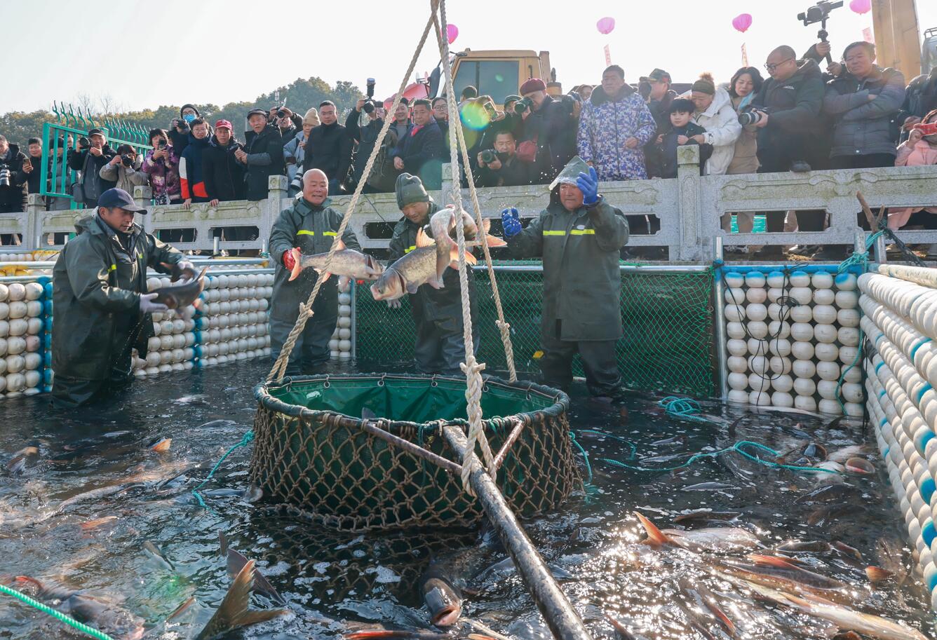 “起魚啦!” 1月27日上午,伴隨著吆喝聲,肥美的鰱魚、花魚、鯉魚在大網中活蹦亂跳,十里溱湖人歡魚躍,濺起串串水花,引得游客爭相拍照。不少游客第一時間開啟抖音直播,將泰州市姜堰區溱湖冬捕的歡騰場景分享給全國各地網友。從2018年起,一年一度的溱湖冬捕從未間斷,人們用冬捕的方式來慶祝一年的豐收,喜迎新春的到來。 今年冬捕的主題是“龍騰大澤,漁悅溱湖”,期望新年討個好彩頭,生活越過越紅火。 溱湖位于江蘇里下河腹地,以水質清純、物產豐富、風景秀麗著稱,是“水韻江蘇”的典型代表。 “捕魚在很多人眼里看似簡單的活兒,但在6000畝的溱湖水面上捕魚,絕非易事。它不同于查干湖冰面上捕魚,原始捕魚的方式,讓當地人找到了以前的快樂。”溱湖文旅集團總經理肖娟娟說。 “趕魚”。記者了解到,這幾年冬捕,專門從外地趕來的專業捕魚隊和捕魚高手,同溱湖周邊的村民一道,半個月前就下網撈魚,將寬闊水域里的魚兒驅趕到特定的區域,便于集中捕撈。 “下網”。記者在現場看到,包魚的大網由兩邊的動力船緩緩地向前拉,網里的魚兒很是興奮,成群結隊躍出水面,構成了一幅“豐收圖”。 “起網”。漁網漸漸收攏,鬧騰的魚群頓時像炸開了鍋,“撲通撲通”的聲音不絕于耳,水下的魚兒仿佛也要躍上水面,看看這大美溱湖的景色,瞅瞅岸邊歡樂的人群。 “起運”。現場的捕魚大師將一條條大魚逮進網兜,由吊車起運上岸。一網兜魚足有一千多公斤,十多條“巨無霸”令人嘖嘖稱贊。捕魚師傅告訴記者,這次捕獲了一條49.13公斤的鳡魚,是今年冬捕的“魚王”,并以5.8萬元的價格被本地餐飲企業買走。 承載的是豐收的喜悅,寄托的是對新年的祝福。此次冬捕,直播盛況火力全開,省內外近30家媒體長槍短炮記錄了冬捕精彩瞬間。自助烤魚、燉魚湯、拍賣魚王、簽訂合作協議……活動接連不斷。 “今年冬捕與往年有什么不一樣?” “溱湖冬捕,我一次沒落下,今年冬捕更有看頭,不僅有國內游客,還有外國友人在現場參與烤魚教學,可見溱湖冬捕的知名度已經走向了世界。”來自浙江的旅游達人小黑向記者說了他今年的感受。 十里溱湖魚蝦美,春生夏長冬捕忙。據介紹,溱湖冬捕將一直持續到春節前,捕魚總量預計達到25萬公斤,同時還將在線上線下開啟溱湖年貨大集市,舉行魚苗放養儀式,計劃放養4萬公斤魚苗。這場冬捕,漁網碰撞出的是豐收的火花,人們收獲的是幸福的年景。 |