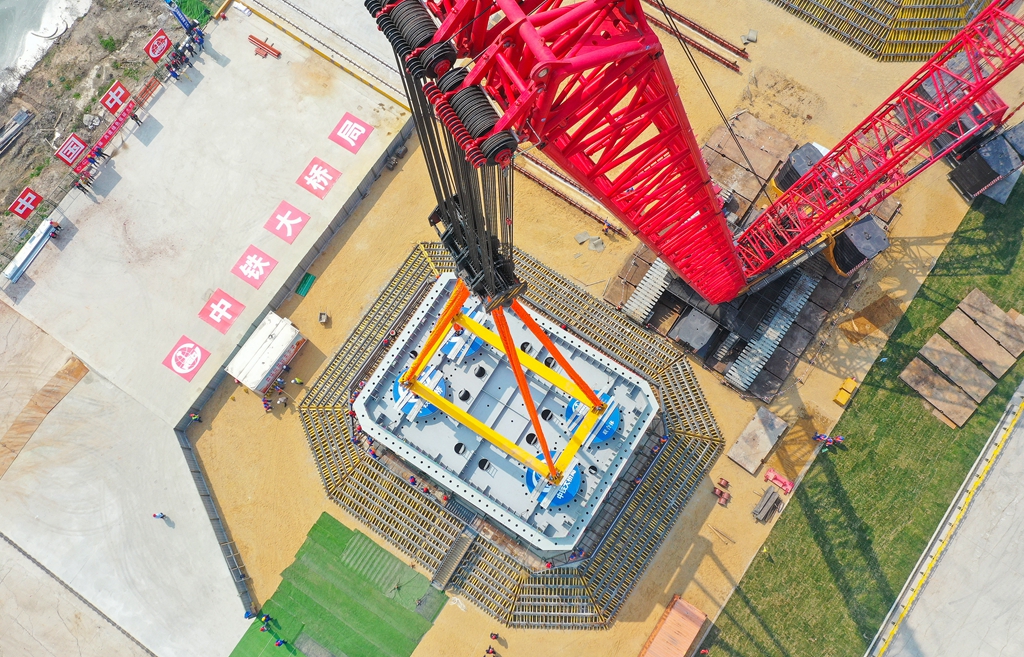 大橋南航道橋北主塔位于靖江市馬洲島。高350米的北主塔為門字形結構,是世界最高懸索橋索塔,采用世界首創鋼箱—鋼管約束混凝土組合索塔設計,分上下游兩幅塔柱施工,每個塔柱30個節段,將像搭積木式的層層向上疊加安裝。本次吊裝的北主塔T1鋼塔首節段,長18.2米、寬13.7米、高3.6米,重量約720噸,為關鍵控制性節段,也是難度最大、精度要求最高的安裝節段。