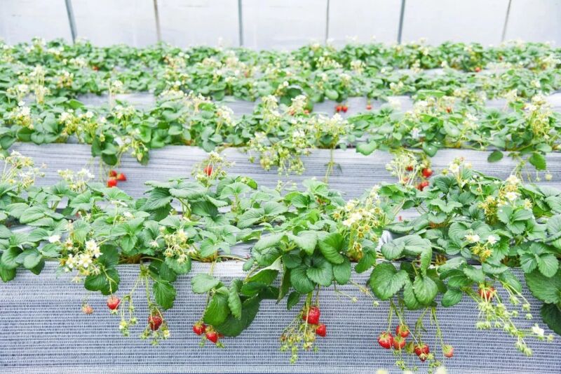 “立架高栽是一種新的栽培模式,不用彎腰,省工省力、清潔輕便、綠色高效。”徐洪介紹,傳統栽培草莓的土壤中容易滋生病菌,發生土傳病害。立架高栽采用的是專用草莓種植基質,杜絕了土傳病害的發生。園內草莓苗自帶營養基質,可減少病害發生的可能。此外,還在草莓葉表面均勻鋪撒一些細小的木屑,木屑中混入了肉眼看不到的捕食螨。利用捕食螨“以蟲治蟲”,減少了農藥的使用。 周康偉介紹,草莓大棚里采用了水肥一體機,將水和營養液通過滴灌系統,均勻送入種植基質,節水節肥節約人力,還能科學地給每棵植株提供均衡營養,使草莓的生長發育始終處于最佳狀態,促進果實品質的提高。