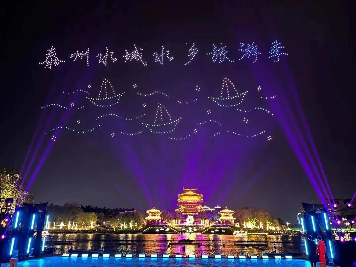 當晚,800架無人機以天為幕、以城為景,在聲光電的絢爛襯托下閃耀登場。以天為幕,以城為景!敖吹谝粯恰蓖窃谝股斜恍D點亮!八背踅ㄓ谀纤,多少人曾經登上它眺望海天一色,如今大海褪去,但望海之情猶在,依舊在泰州人的心中流光溢彩。