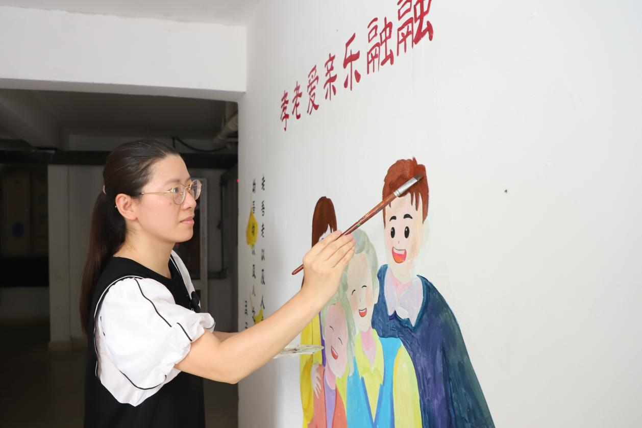 △圖為城南辦事處睦鄰點的共享圖書角。 去年下半年,城南辦事處把睦鄰點化身為“圖書角”,在各村(社區)睦鄰點打造社區“共享圖書角”,選定紅色書籍、法律讀本、兒童讀物、生活休閑類、科普教育類等書籍報刊,滿足居民的閱讀需求,讓居民在家門口就能以書會友,共享閱讀之樂,讓書香飄得更遠。各村(社區)還積極開展“親子讀書會”“共讀一本書”等閱讀活動,營造良好的閱讀氛圍。 營造“開門見文明”的樓道 樓棟作為小區管理的基石,是鄰里情感交流的單元平臺。在不少小區,文明、孝老、睦鄰等主題墻繪逐步取代了昔日的“臟亂差”和廣告“牛皮癬”,整潔靚麗的“文明墻”讓和諧新風撲面而來,樓道彩繪不僅美化了環境,也提升了樓宇的文明程度。