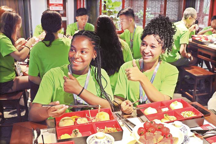 “還行,不難學!泵绹鴮W生Michael Zhang說,之前在家里吃過餃子,這卻是第一次自己動手包餃子。 包餃子要用筷子挑餡料,很多學生對筷子“無從下手”。“我還是第一次拿筷子,不會用!泵绹鴮W生Mathews Lee'Anya有點靦腆!皼]事,我教你!笔√┲懈叨䦟W生楊欽園手把手教起她來,“這樣,用拇指、食指和中指輕輕拿住筷子,無名指墊在筷子下面,五指攏起來,把筷尖對齊,慢慢夾取食物! Mathews Lee'Anya反復嘗試,終于成功夾到餃子餡,開心得咯咯笑:“哇,好神奇!我學會了!” 來泰州自然不能錯過地道的泰州早茶。23日上午,美國師生來到泰州老街桃園里餐廳,品嘗傳統泰州早茶。 當熱氣騰騰的“一茶三點一面”依次端上八仙桌,美國師生一個個“哇”地張大嘴巴,紛紛掏出手機拍攝!斑@是‘泰州三寶’,燙干絲、魚湯面、蟹黃肉包。這是馬蘭頭燒賣、秧草包、蝦仁蒸餃,又稱‘日月星辰’組合!泵鎸ο銡庹T人的美食,聽著泰州早茶集團運營部部長黃美云的介紹,美國師生立馬開動,邊吃邊不住豎起大拇指點贊“Good!”