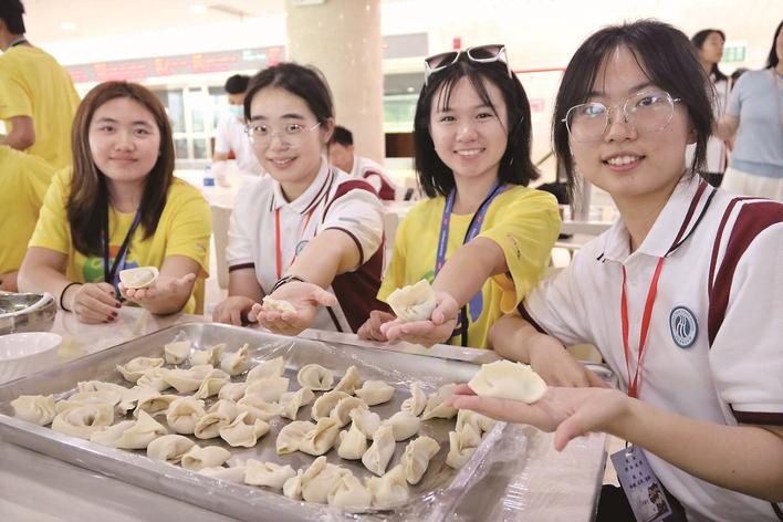 當天下午,省泰中老師董佳琪還帶領中美師生一起練習八段錦!霸诿绹,也有很多中國武術組織,以華人為主,大家經常聚在一起練習,一些當地的美國人也會參與進來,體驗中國武術的魅力!泵绹鴰ш犂蠋烰ianqing Zhang說。 中醫作為我國傳統文化的瑰寶,博大而精深。23日下午,美國師生相繼來到揚子江龍鳳堂藥業集團、江蘇中藥科技園,感受中醫中藥的獨特魅力。在江蘇中藥科技園,美國師生還觀賞了清雅的茶藝展示,一同品鑒香茗。 包餃子品早茶,嘗地道“泰州味” 在我國,餃子是吉祥團圓的象征,每逢新春佳節,家家戶戶都要吃餃子。為使美國師生“入鄉隨俗”,22日中午,省泰中食堂的師傅們特地準備了餃子皮和餡料,帶領中美師生一起包餃子。