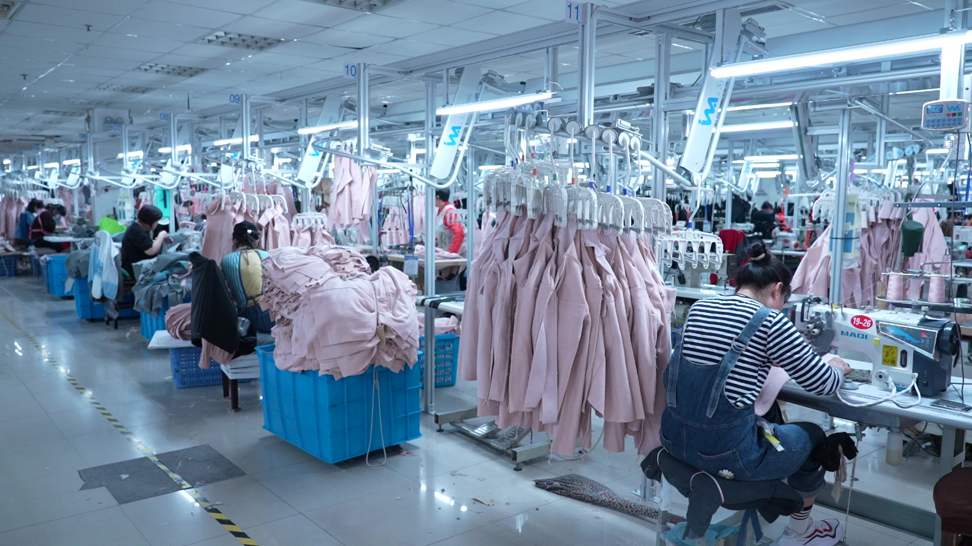 8月22日,記者在江蘇維娜時裝有限公司車間看到,每25臺縫紉機組成一條流水線,在智能吊掛系統的助力下,各式各樣的時裝產品源源不斷走下產線。