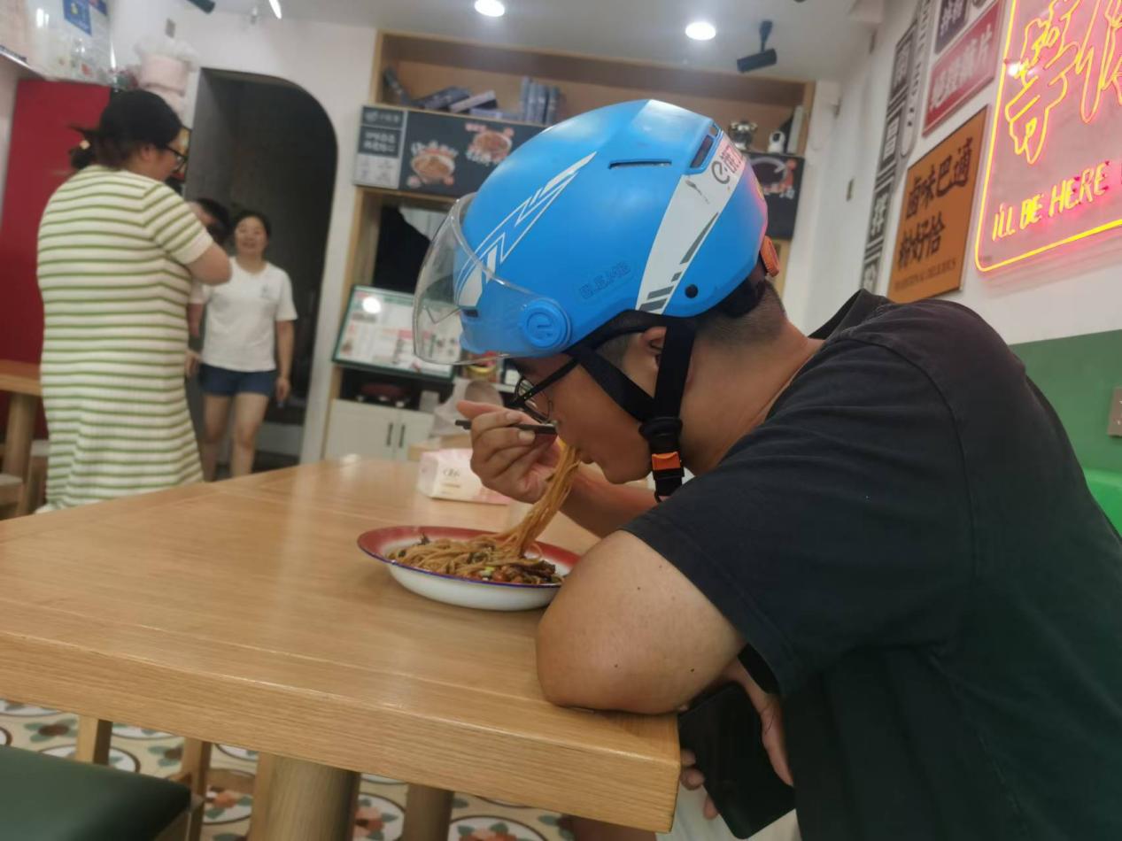“走,吃飯去。”9月5日中午1時許,餓了么外賣騎手王曉偉騎車來到興化市板橋西路,停在了小粉家店門口,“這里吃飯,我們外賣騎手可以打折,實惠”。