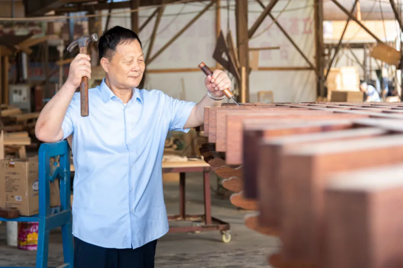 置身南山寺,重檐廡殿,梵音陣陣,古意盎然。 近幾年來,位于城西街道的毛華國工作室接連承接“大單”,南山寺改造一期工程也是其中之一。身著藍色工作服,穿梭在工廠木工車間,時不時停下來手把手指導。在江蘇科宇的木材加工工廠內,每天都能看到這樣的情景。 作為企業負責人的毛華國,耐心地指導工匠師傅劃線、裁料,現場木花飛瀉、斧鋸聲聲在耳。在工廠的另一邊,陳列著各式各樣的古建模型,這方小小的天地則是毛華國一手打造的“古建王國”。 “天王殿、大雄寶殿,我們全部用的是傳統木質榫卯結構,不用一顆釘子,不用一滴膠水,各構件通過精巧咬合,形成了牢固并富有彈性的框架結構。”毛華國介紹,“近19米高的大雄寶殿,僅木質斗拱就用了8種形式,使其各盡其能。”