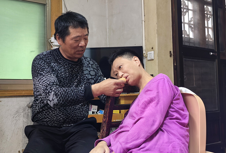 妻子長期臥床造成肌肉僵硬,病情逐步發展,先是腿腳不靈便,后來引發全身癱瘓,需借助輪椅行走。潘勇買來專業書籍學習按摩,一有空就幫妻子按摩,緩解萎縮癥狀,夜里每隔兩個小時幫妻子翻身成了他的“生物鐘”。 時光穿梭,一晃就是12年,歲月的風霜刀劍未曾在他們的婚姻里留下一絲裂痕。病痛時,他為她熬藥,目不交睫;疲憊時,他為她按摩,輕言細語。日子再苦,他們的手始終緊緊相牽,像兩棵相互依偎的樹,根系在地下纏綿交織。現在,女兒大學畢業了,在高港一家公司上班,每次回來也能搭上一把手。潘勇欣慰地說:“只要春愛活一天,再苦再累,我都會照顧好她一天。” 感恩身邊援助之手