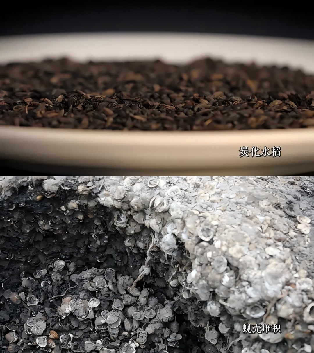 草堰港遺址的完好保存,不僅見證了先民的勞動智慧與藝術追求,也讓大家從他們的生活場景中,感受到濃濃的人間煙火氣。在草堰港遺址區,除芡實、菱角等植物遺存外,還有一片黑色堆積,即炭化稻,這也證實草堰港的先民,在7000年前就已經吃上米飯。眾所周知,稻殼本身是黃色的,稻米是白色的,由于埋藏在地下幾千年,在缺氧甚至是無氧環境下,有機質被慢慢分解,便留下一些像碳一樣的物質叫作炭化稻。據了解,考古中發現的水稻遺存,有肉眼可見的稻米、稻谷、穗軸等大遺存,也有從土壤沉積物中提取到的植硅體等微體遺存,經采樣鑒定,可確定是人工栽培稻。
