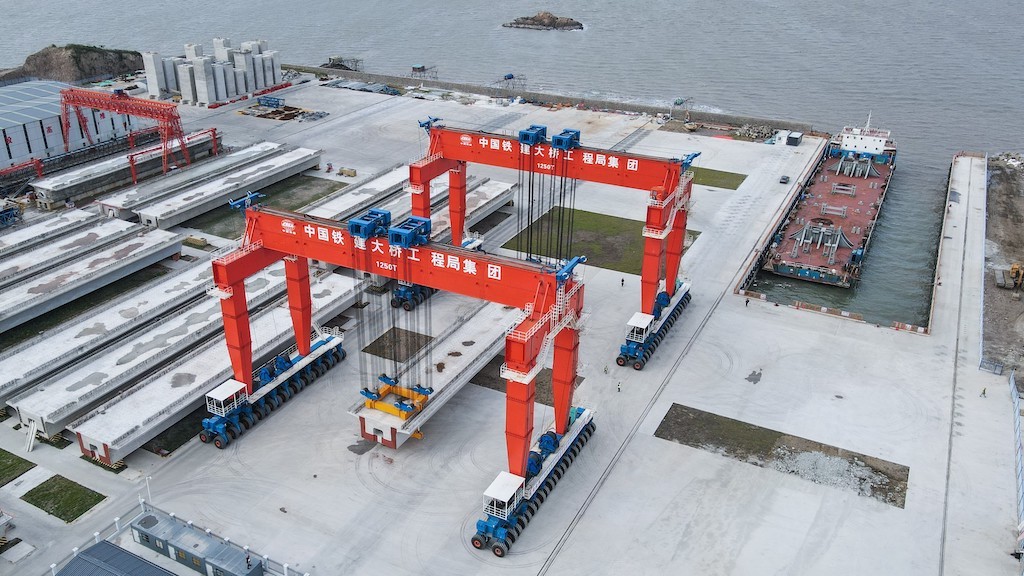 不僅硬件過硬,“滄龍號”還搭載了智能化控制系統和激光矩陣傳感統等先進技術,具備自動行駛和行走自動糾偏,以及同步、防滑、協調轉向等功能。2臺搬梁機可以同步行走,實現雙機聯動,精準高效開展吊運施工。目前,“滄龍號”搬梁機已用于單體1700噸的預制箱梁搬運任務,為寧波舟山港六橫公路大橋二期工程等兩座世界級跨海大橋建設保駕護航。 “大跨度會解決橋梁施工中很多難題,我們在研制這些重型設備的時候,是以基本建設為基礎,一切服務于我們的大橋,服務于基礎設計,設計研發的核心是不但要滿足使用功能,更要深化智能化應用、提高性價比。”中鐵建大橋工程局集團靖江重工有限公司執行董事、黨委書記張文軍說。