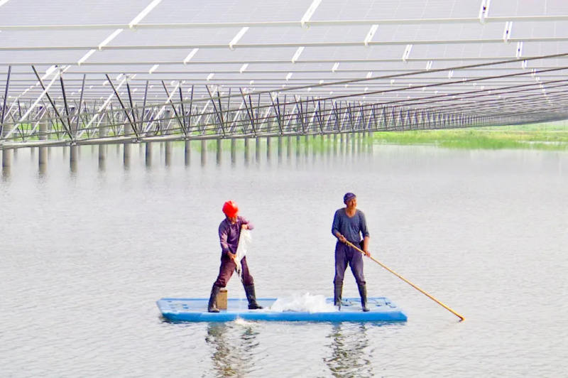 近日,泰州市海陵區在項目建設上持續發力,罡楊鎮純垛村170畝“漁光互補”項目實現并網發電,同步開啟“水上發電、水下養魚”的立體發展模式,迎來重要節點。 “前段時間我們投放了鳊魚和河蝦,河蝦預計國慶節就能捕撈上市,整個魚塘的畝均收入較以前能增加1000多元。”養殖戶陳華良提到,光伏板下的魚塘租金只有以前的三分之一,大大降低了養殖成本。