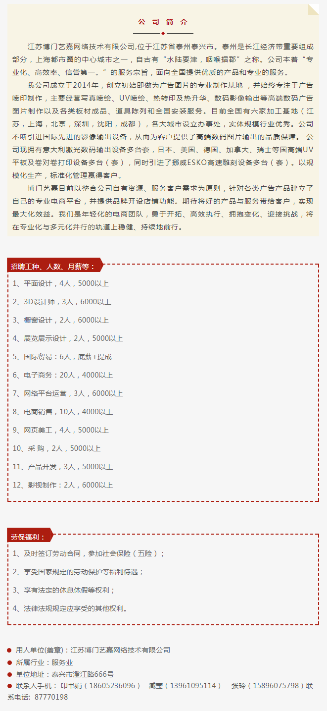 江蘇博門藝嘉網(wǎng)絡(luò)技術(shù)有限公司2019招聘簡(jiǎn)章