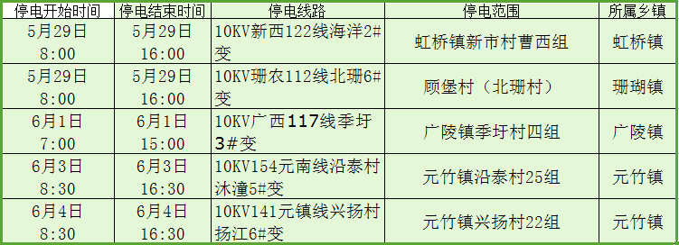 停電公告(05月29日-06月04日)