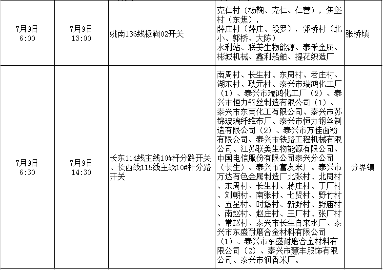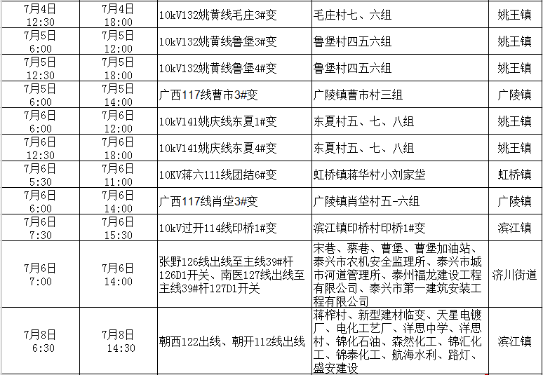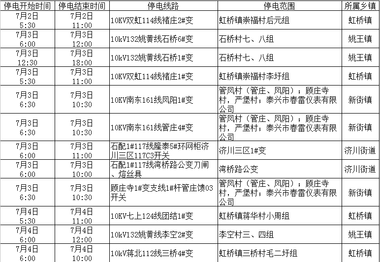 停電公告(07月03日-07月09日)