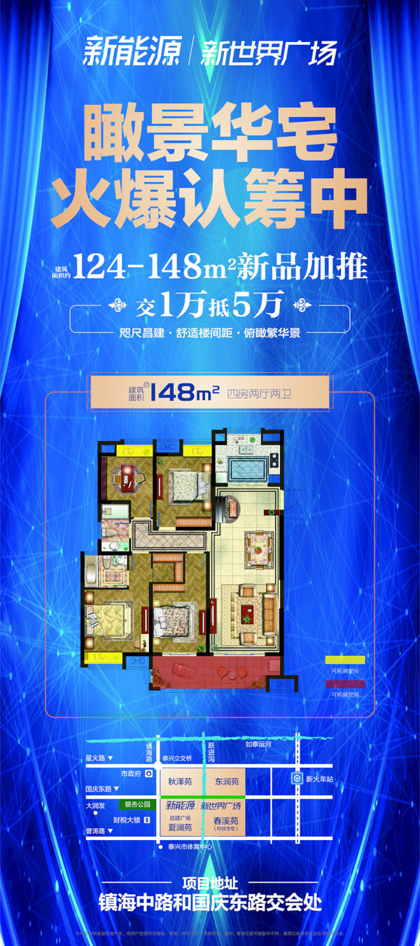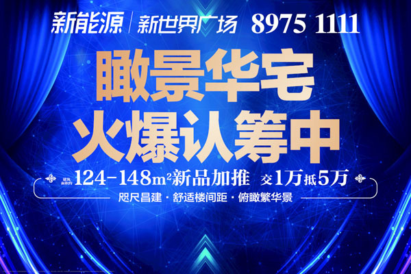 新能源·新世界廣場 瞰景華宅 建筑面積約124~148㎡新品加推,交1萬抵5萬,全城火爆認籌中。緊鄰繁華商業(yè)昌建廣場,出門就可逛街的房子,超舒適樓間距,前后無遮擋,俯瞰繁華景,預(yù)約熱線:89751111
