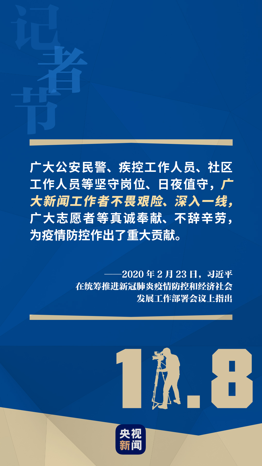 今年年初,面對來勢洶洶的新冠肺炎疫情,廣大新聞工作者同醫(yī)務工作者一起逆行出征,奔赴抗疫一線。 于是,我們和世界一道,看到在習近平總書記親自指揮、親自部署下,中國打贏這場疫情防控的人民戰(zhàn)爭、總體戰(zhàn)、阻擊戰(zhàn)所經(jīng)歷的一個個震撼人心的畫面—— 廣大醫(yī)務人員白衣為甲、逆行出征,舍生忘死挽救生命。廣大黨員、干部帶頭拼搏,人民解放軍指戰(zhàn)員、武警部隊官兵、公安民警奮勇當先,廣大科研人員奮力攻關,數(shù)百萬快遞員冒疫奔忙,180萬名環(huán)衛(wèi)工人起早貪黑,新聞工作者深入一線,千千萬萬志愿者和普通人默默奉獻……
