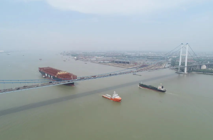 24000TEU級集裝箱船是目前全球載重量最大、裝箱量最大的新一代超大型集裝箱船型,船長399.99米,寬61.3米,甲板面積達2.4萬平方米,最大堆箱層數25層。本次“鑫福108”輪采用“兩吊四綁”的方式拖帶出江,拖帶編隊長度740米、寬度82米,長江江蘇段拖帶里程達125公里。