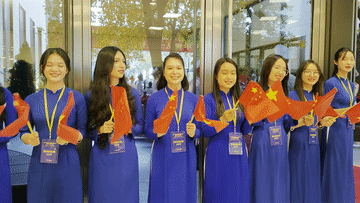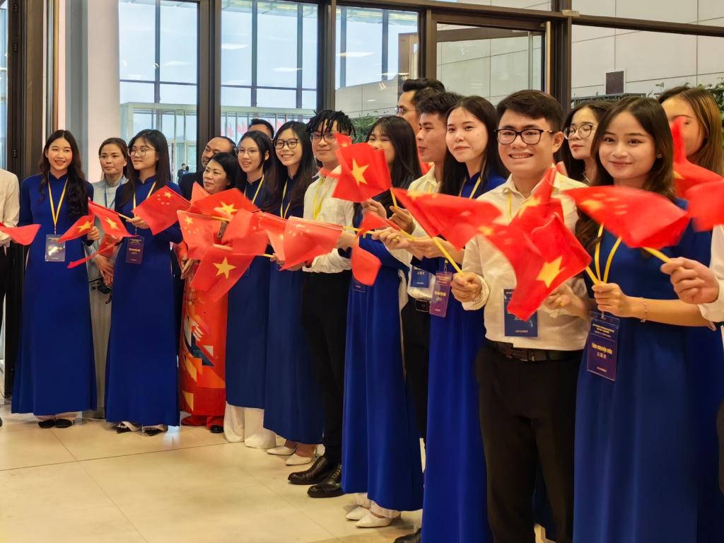 中越友好人士及青年見面會現(xiàn)場氣氛熱烈,鮮花和兩國黨旗國旗交相輝映,匯成一片喜悅的海洋。
