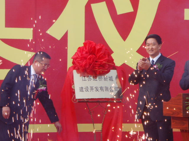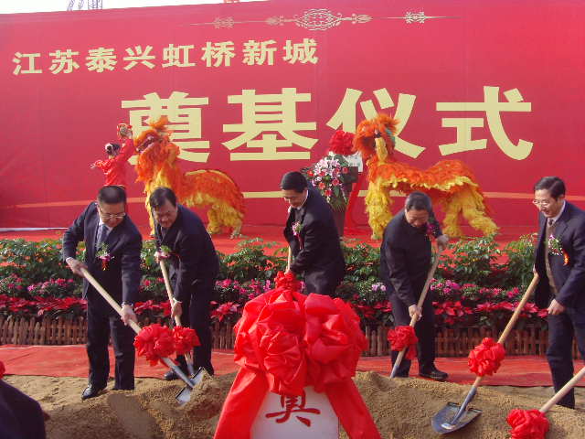 泰興市領導張兆江、高亞梓、張澤民、劉榮華、田之本、張偉、姜文湘、朱從云和投資建設方代表出席了奠基儀式,并為虹橋新城項目開工奠基。泰興市委書記、市人大常委會主任張兆江和香港凱旭集團總裁胡斌為江蘇虹橋新城建設開發有限公司揭牌。泰興市委常委、副市長、虹橋工業園區黨工委書記、管委會主任劉榮華主持了奠基儀式。 虹橋新城項目于 泰興市委副書記、市長高亞梓在奠基儀式上指出,虹橋新城項目是江蘇省虹橋工業園區積極落實市委、市政府打造泰興“一體兩翼”新格局的重大戰略部署,創新發展思路,運用市場化機制,成功引進的重大基礎設施項目,也是全市的一項重大工程。新城項目的開工建設,預示著園區的基礎設施建設進入全面加速期,將有力提升園區整體形象,加快推進我市“學趕蘇南、跨越發展”進程。高亞梓希望合作各方密切協作,高起點、高標準實施項目建設,努力打造一座生態、宜居、樂活的濱江新城,并要求虹橋工業園區和相關部門把新城建設作為市委、市政府的重點工程,主動服務、創新服務、高效服務、優質服務,為新城建設開辟綠色通道,提供一切便利條件,推動虹橋新城項目快建設、早見效。