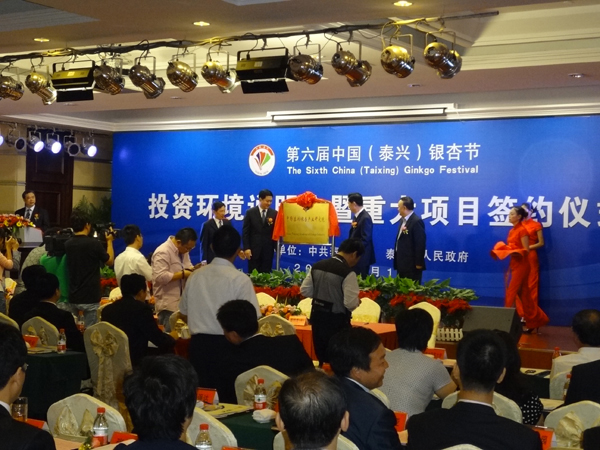 16日上午,舉行了投資環境說明暨重大項目簽約儀式,同時還為銀杏產業研究院、南工大技術轉移中心泰興分中心揭了牌。簽約儀式上,簽約的35個項目總投資169億元,協議利用外資1.88億美元。其中億元以上項目20個,10億元以上項目6個,最大項目的投資規模達45億元,單體平均投資規模達4.8億元。35個項目中,工業項目21個、農業項目6個、服務業項目7個,科技合作項目1個,新興產業項目8個。