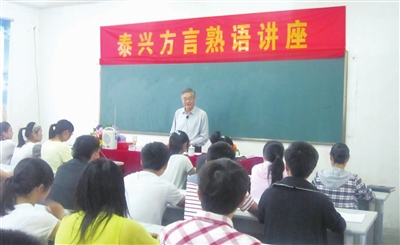 中國江蘇網5月28日訊 5月23日下午,泰州市形勢政策教育宣講團成員、泰州市百姓名嘴呂耕樵來到市振泰高級中學,為60多名師生代表作泰興方言熟語講座,其生動有趣的方言演講深得學生喜愛。呂耕樵是黃橋鎮人,2005年退休后著手研究泰興方言,精心編著并出版《泰興民俗風情》、《泰興方言熟語拾零》和《泰興方言辭典》,填補了地方方言文化研究的空白。(記者 盧怡 攝)