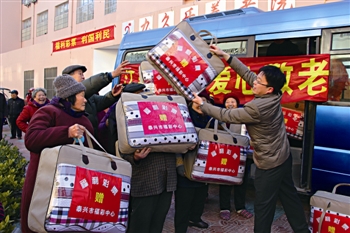 。ㄓ浾 葉桂華 通訊員 葉余華 王 榮)現下,已進入數九寒冬。為確保敬老院老人安全溫暖過冬,泰興市12月27日舉行了“民政惠民生、福彩送溫暖”大型公益活動,1000多床嶄新棉被分發至各鄉鎮(街道)敬老院,給老人們送去溫暖。 在泰興市區九久樂養老院,該市民政和福彩中心的工作人員開著中巴車,送去了近100床棉被。今年70多歲的季克信老人高興地打開嶄新的棉被,拉出來給記者看:“顏色真好看,質量又好。冬天到了,能收到這樣的禮物,真的是很高興!”自2000年電腦福利彩票在泰興銷售以來,該市每年都舉行“扶老、助殘、救孤、濟困”福彩公益活動。2011年,民政、福彩中心拿出200多萬元,用于鄉鎮(街道)敬老院生活設施改造;2012年又出資400多萬元,改善社區和新農村建設;今年又先后組織福彩公益金關愛留守兒童和殘疾兒童等公益活動。