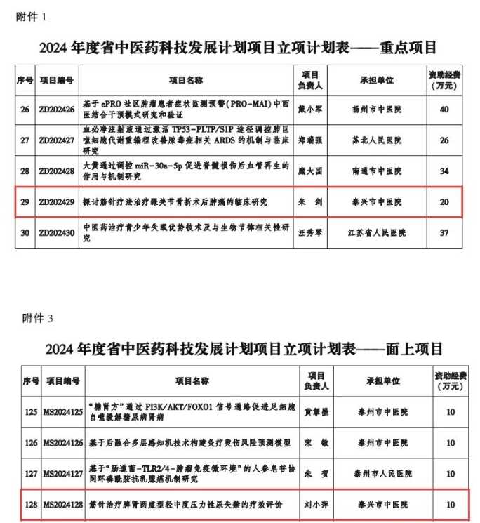 近日,江蘇省中醫(yī)藥管理局下達(dá)2024年度省中醫(yī)藥科技發(fā)展計(jì)劃項(xiàng)目立項(xiàng)計(jì)劃,泰興市共2個(gè)項(xiàng)目獲批,其中泰興市中醫(yī)院朱劍《探討筋針療法治療踝關(guān)節(jié)骨折術(shù)后腫痛的臨床研究》課題獲批重點(diǎn)項(xiàng)目,實(shí)現(xiàn)泰州重點(diǎn)項(xiàng)目“零”的突破。