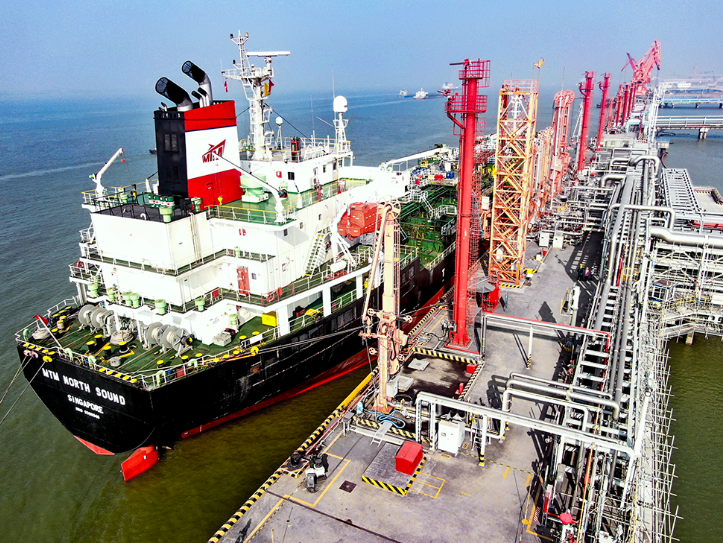 近期,新浦化學(xué)(泰興)有限公司萬噸級(jí)液體化工碼頭上也開始忙碌起來。隨著一艘外輪停靠泊位,碼頭上的裝卸臂便徐徐伸展開來,用“觸角”一樣的接頭去尋找船舶管道上相應(yīng)的法蘭,自動(dòng)對(duì)接上去,開始執(zhí)行這一船燒堿的裝載任務(wù)。
