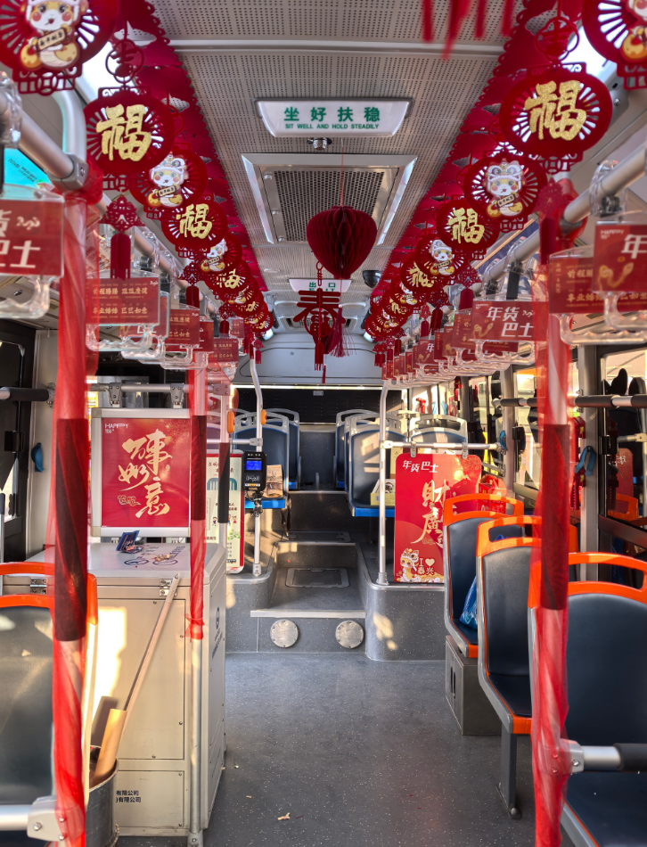 春節(jié)期間,在泰興城區(qū)大潤(rùn)發(fā)公交站臺(tái),一輛公交車特別喜慶,車前“年貨巴士”字樣尤為醒目,車身兩側(cè)有蛇年大吉、福娃送福等主題裝飾,車廂內(nèi)以紅色為主進(jìn)行裝扮,“年”味十足。市民蔡桂芳提著剛買的年貨喜滋滋地上了車:“家里已經(jīng)采購(gòu)了不少年貨,我今天特意列了張清單,再來(lái)補(bǔ)充一些。而且這車?yán)镞有不少我們的土特產(chǎn),正好給女兒帶點(diǎn)回上海。”濃濃的年味中,乘客們相互交談著,車廂里歡聲笑語(yǔ)。