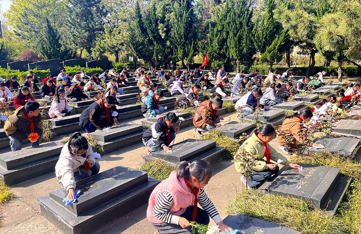 指尖致敬傳真情 在莊嚴(yán)肅穆的墓葬區(qū)內(nèi),學(xué)生們手持抹布,俯身輕拭烈士墓碑。“觸摸到墓碑的瞬間,我仿佛感受到了跨越時(shí)空的溫度,讓我懂得了什么是永恒的炙熱。”泰興市南新初級(jí)中學(xué)七(1)班學(xué)生葉洋濤感慨道。擦拭完畢,大家手捧鮮花,輕輕擺放在墓碑前,朵朵白菊寄托著深深的哀思與崇高的敬意。
