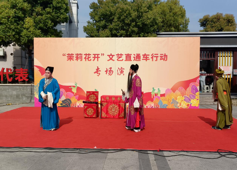 4月8日下午2時(shí),江蘇省演藝集團(tuán)揚(yáng)劇團(tuán)“茉莉花開”文藝直通車駛?cè)胫袊鴼v史文化名鎮(zhèn)——泰興市黃橋鎮(zhèn),在30℃的春日驕陽下,為當(dāng)?shù)厝罕姭I(xiàn)上一場兼具傳統(tǒng)韻味與現(xiàn)代風(fēng)采的露天文化盛宴。盡管熱浪襲人,數(shù)百名觀眾仍齊聚廣場涼亭區(qū),以掌聲與歡呼聲回應(yīng)演員們的傾情演出。經(jīng)典與創(chuàng)新交融老戲臺(tái)煥發(fā)新活力演出以氣勢磅礴的吹打樂《校場比武》拉開序幕,康賀、賈建銀等六位演奏家以鑼鼓笙簫再現(xiàn)古戰(zhàn)場雄渾氣象,鏗鏘樂聲瞬間點(diǎn)燃現(xiàn)場氛圍。隨后,天津衛(wèi)視《王者歸來》鄧麗君模仿秀亞軍劉佳寧以甜潤聲線連唱《小城故事》《甜蜜蜜》三首金曲,引得觀眾齊聲合唱,涼亭內(nèi)外宛若懷舊音樂廳。