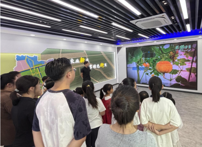 在現(xiàn)代農(nóng)業(yè)展廳的大屏幕前,孩子們和家長們一同觀看了新街鎮(zhèn)現(xiàn)代農(nóng)業(yè)宣傳片,宣傳片生動展現(xiàn)了新街鎮(zhèn)現(xiàn)代農(nóng)業(yè)的嶄新面貌:從傳統(tǒng)農(nóng)耕到智慧管理的飛躍。“大家看,我們的大棚里安裝了各種傳感器,對陽光、溫度、濕度、土壤養(yǎng)分進行實時監(jiān)測和自動調(diào)節(jié)。就像給莊稼裝上了‘智能管家’,讓它們在最舒適的環(huán)境里生長。”志愿者介紹道。孩子們紛紛睜大好奇的眼睛,開啟現(xiàn)代農(nóng)業(yè)的“探秘之旅”。當巨大的屏幕上出現(xiàn)無人機在田野上空飛翔作業(yè)、機械臂自動采摘蔬果的畫面時,孩子們發(fā)出了陣陣“哇”的驚嘆聲。