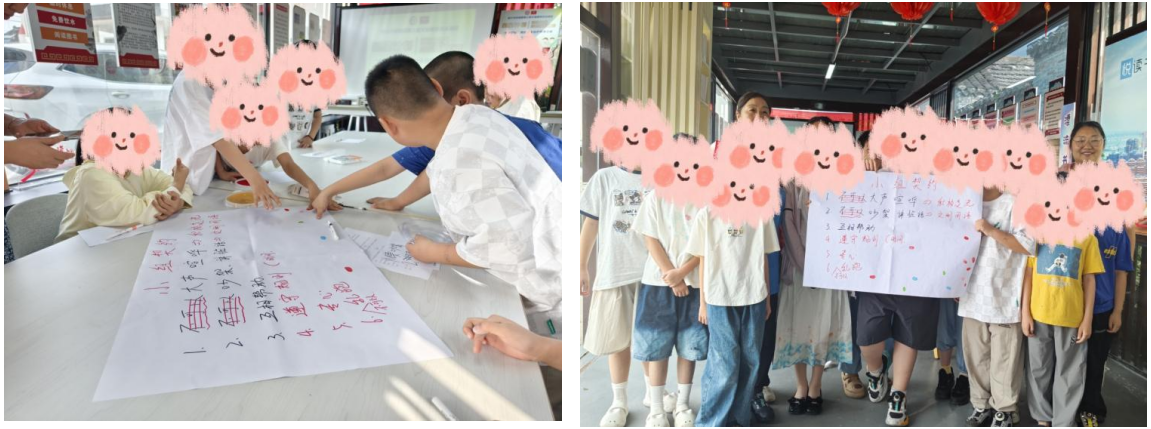 活動(dòng)首先以“你劃我猜”破冰游戲消除陌生感,引導(dǎo)兒童自主制定小組契約。工作人員通過“重復(fù)提案鼓勵(lì)機(jī)制”,如“大膽說出,不考慮重復(fù)”,激發(fā)兒童規(guī)則共建參與率100%,形成可視化行為公約。 二、游戲化教學(xué),破解知識(shí)壁壘