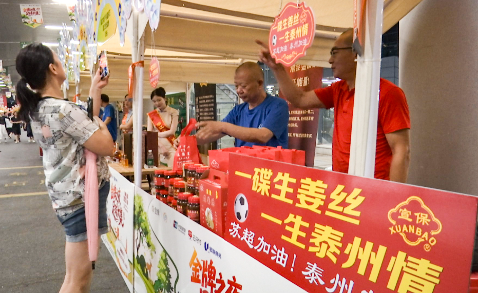 現(xiàn)場28000名球迷,亦是28000名潛在消費者。為做好足球票根經(jīng)濟,泰興市在賽場設(shè)置“中國銀杏之鄉(xiāng)”展銷區(qū),黃橋燒餅、泰興肉渣、咖啡元麥飲、秋月梨、銀杏制品等特色農(nóng)副產(chǎn)品盡數(shù)陳列。因展銷區(qū)緊鄰常州球迷區(qū),不少常州消費者被香味吸引前來。“上大學(xué)的時候,有同學(xué)是黃橋的,帶過黃橋燒餅給我們吃,味道很好吃,所以這次要買點吃吃看。”球迷伏女士笑著說。