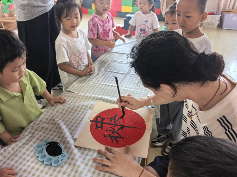 執(zhí)筆寫意傳文化,稚子歡顏迎佳節(jié)。在紅石榴家園——廣陵中心幼兒園里,一場融合傳統(tǒng)文化的特別活動熱鬧開場,小朋友歡聚一堂,現場滿是歡聲笑語。“筆墨傳情迎中秋”環(huán)節(jié)精彩紛呈。卞一鳴老師手持毛筆,在紙上瀟灑揮毫,筆走龍蛇間,“中秋快樂”“闔家團圓”“花好月圓”等祝福語躍然紙上,剛勁有力的字跡引得孩子們陣陣驚嘆。小朋友們圍在桌旁,眼睛緊緊盯著老師的筆尖,好奇地觀察運筆技巧,有的還伸出小手,模仿起書寫姿勢,模樣十分可愛。隨后,老師將寫滿祝福的卡片贈予小朋友,還耐心地講解起中秋習俗,讓孩子們在歡樂中感受傳統(tǒng)文化的魅力。