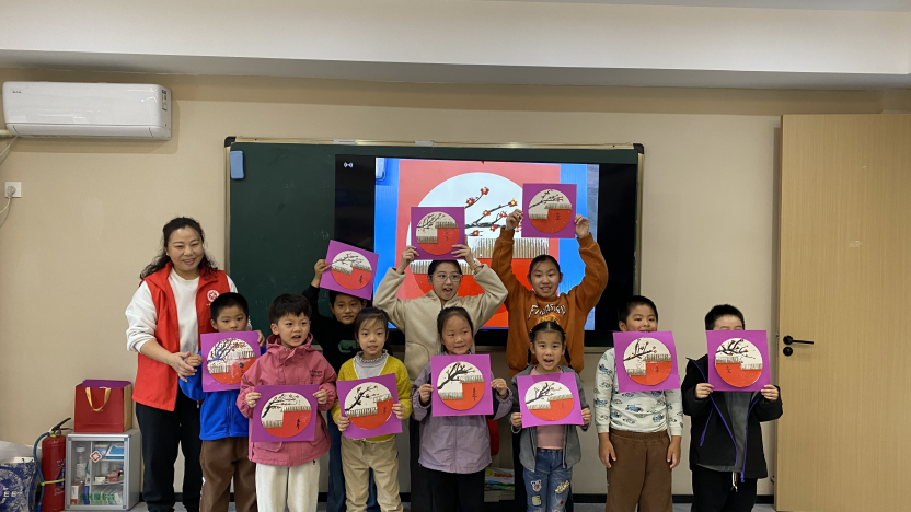過程中,孩子們互相幫助、盡情發(fā)揮——有的細(xì)致裝飾屋檐,有的用墨色濃淡表現(xiàn)梅枝姿態(tài),還有的認(rèn)真題寫“立冬”字樣。志愿者從旁鼓勵(lì)、協(xié)助,現(xiàn)場(chǎng)洋溢溫馨與歡笑。完成作品后,孩子們踴躍展示并分享構(gòu)思,眼中充滿成就感。