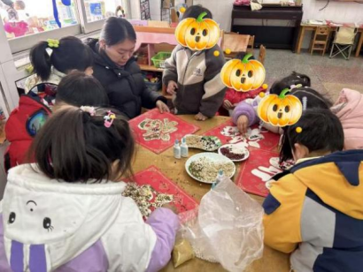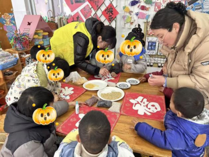 指尖生花,五谷粘福寄愿 “小朋友們,先在五谷顆粒上輕輕涂一點膠,再小心貼到福字上,注意不要把食材放進嘴里哦!”在“五谷粘福”環(huán)節(jié),張橋鎮(zhèn)星火志愿隊志愿者為孩子們發(fā)放了福字底卡、五谷食材、膠棒和一次性餐墊,細致示范手工制作步驟,并反復(fù)強調(diào)安全與衛(wèi)生要點。孩子們分組圍坐,在民政服務(wù)站工作人員和幼兒園老師的巡回指導(dǎo)下,充分發(fā)揮創(chuàng)意:有的用紅豆勾勒福字輪廓,有的用綠豆、小米搭配出別致圖案,動手能力較弱的小朋友也在一對一幫扶下逐步完成作品。現(xiàn)場歡聲笑語不斷,孩子們專注地粘貼每一粒五谷,指尖翻飛間,一幅幅色彩斑斕、充滿童趣的五谷福字逐漸成型,既鍛煉了動手能力,又寄托了對生活的美好期許。