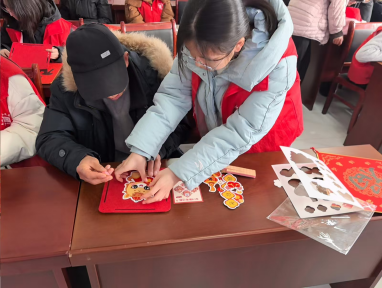 書法體驗(yàn)結(jié)束后,高中生志愿者們協(xié)助老人們開展新春門貼手工制作活動(dòng)。志愿者們耐心講解制作步驟,手把手幫助老人粘貼、裝飾,將喜慶的圖案與真摯的祝福融入每一件手工作品中。老人們專注投入,相互交流、互幫互助,一件件精致的新春門貼在歡聲笑語中完成,為即將到來的春節(jié)增添了濃濃的年味。