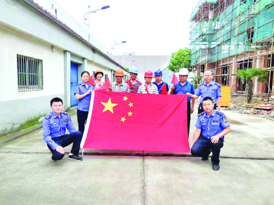 ![]() 市城市管理綜合執(zhí)法大隊(duì)的隊(duì)員們來到建筑工地,和建筑工人們一起與國旗合影。