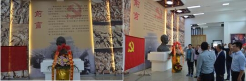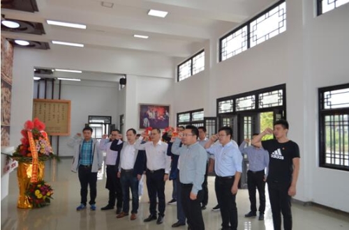 在紀念館瞻仰廳,全體人員瞻仰了泰興縣委第一任書記沈毅烈士銅像。沈毅為泰州人,1925年,25歲的他來到刁家網(wǎng),在刁家網(wǎng)地區(qū)點燃革命星火。從此,“要找共產(chǎn)黨,就到刁家網(wǎng)”在人民群眾中廣為流傳。1928年,28歲的沈毅沒有逃脫敵人的追捕,光榮就義,永遠地離開了刁家網(wǎng),但是他留下的革命火種卻一直在燃燒。此后,歷經(jīng)土地革命、抗日戰(zhàn)爭和解放戰(zhàn)爭,中共泰興縣委先后有力地支援了黃橋決戰(zhàn)和以黃橋為中心的蘇中抗日民主根據(jù)地建設,配合華中野戰(zhàn)軍取得了彪炳軍史的蘇中七戰(zhàn)七捷,最終獲得了泰興全境解放。